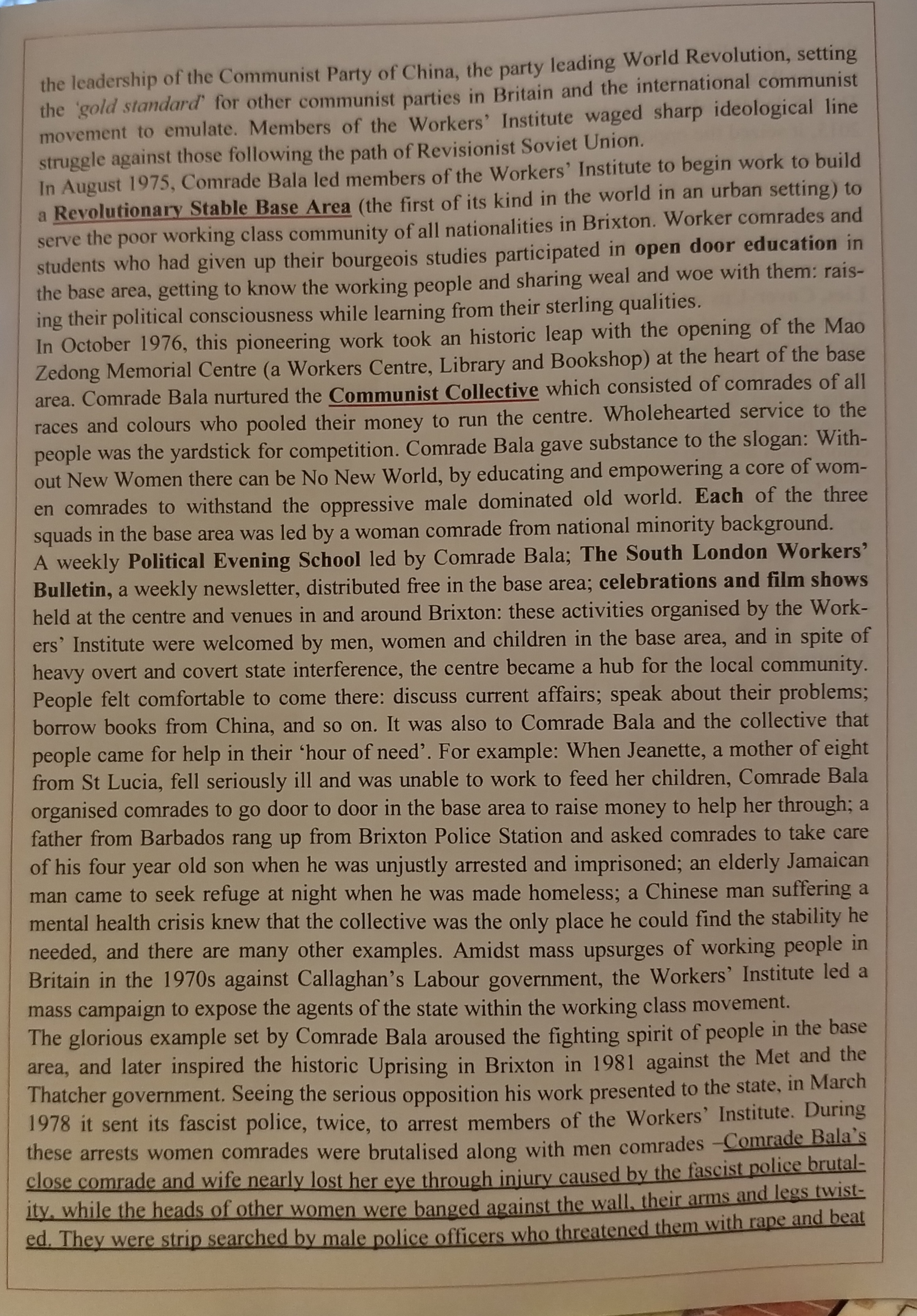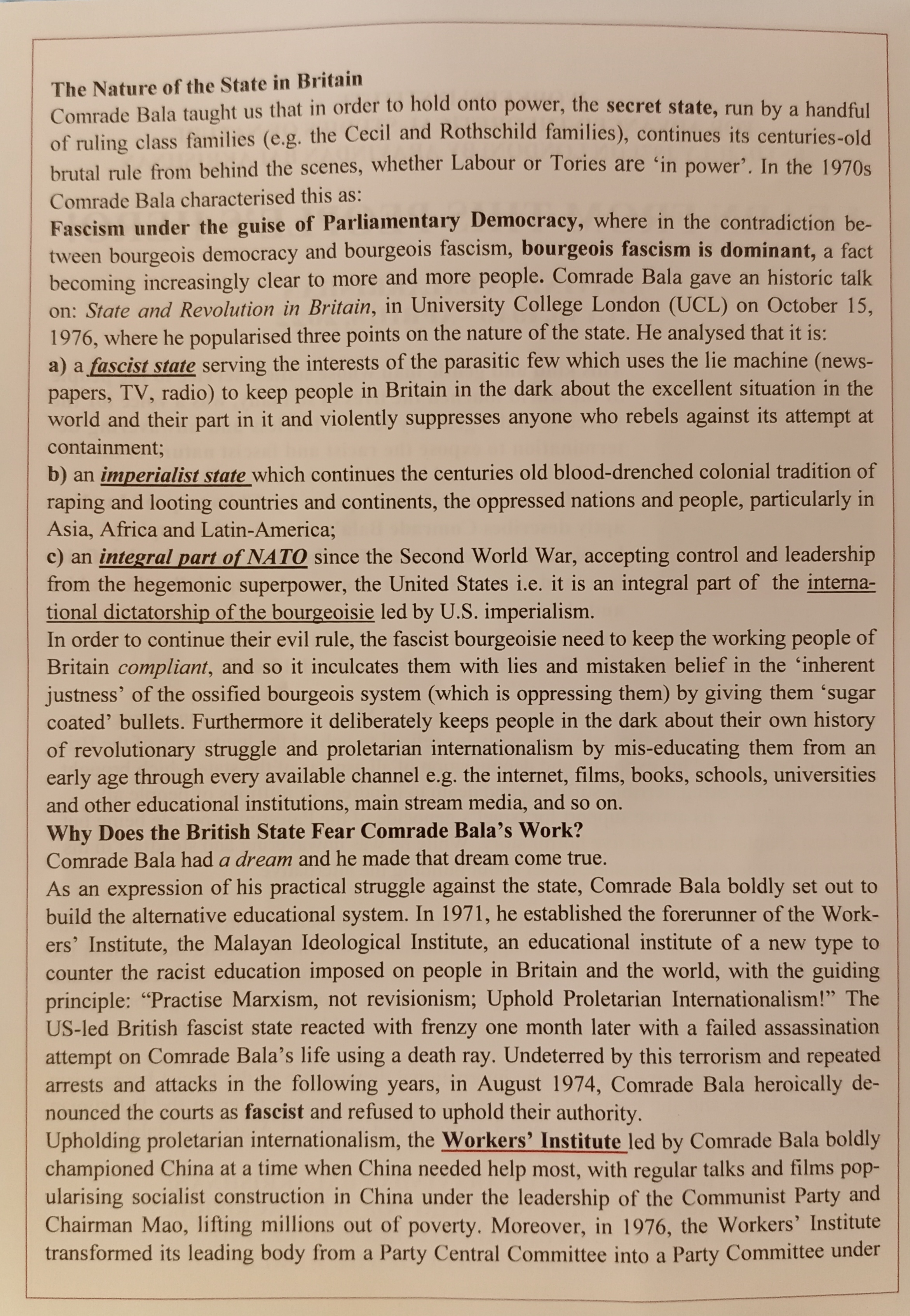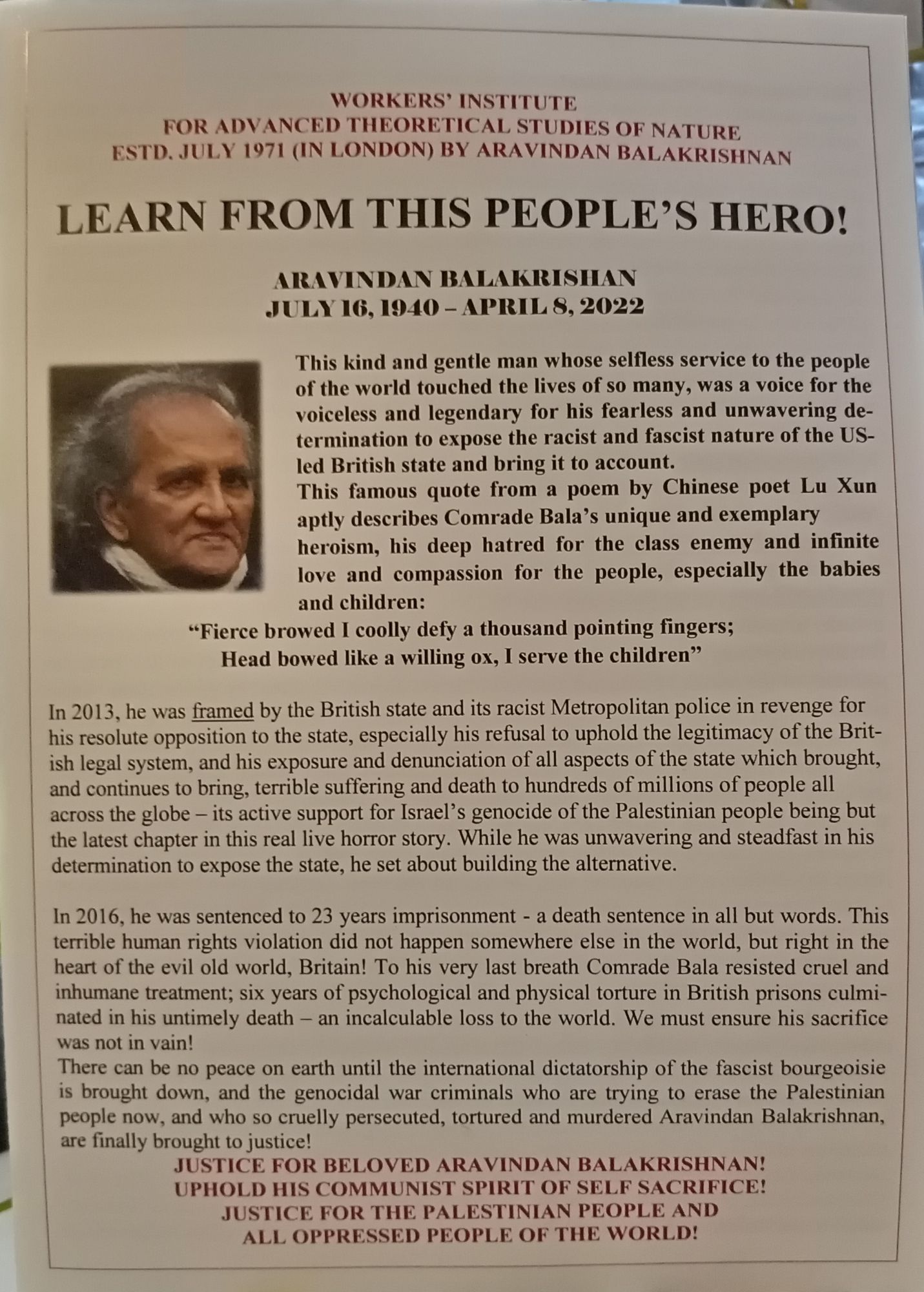The Bourgeoisie will always attack and oppress the most progressive and Revolutionary aspects of the working-class – in this instance the Workers’ Institute of Advanced Marxist-Leninism and Mao Zedong Thought! Comrade Bala was a true hero of the people and his selfless example must never be forgotten!