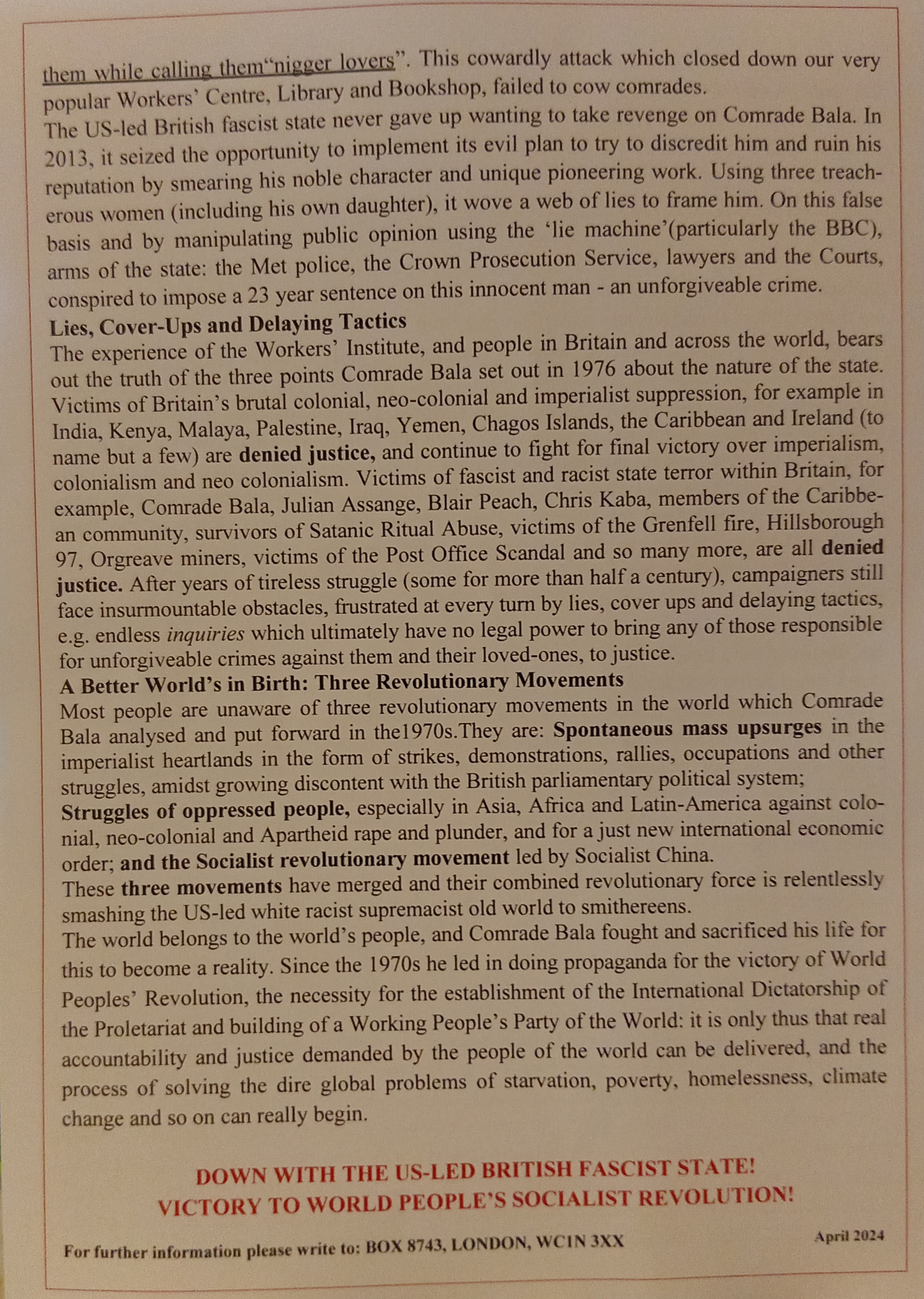 Comrade Bala – and his movement – was persecuted over many decades by the British (Fascist) State. He – and his associates – have been systematically targetted by the agencies of the British (Fascist) State – with Eurocentric racism serving as the prime motivating force. Whilst certain Comrades were imprisoned, beaten and sexually assaulted by the British Authorities – Comrade Bala was imprisoned and finally passed away behind bars!