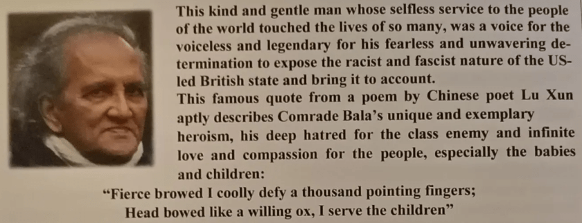 The Bourgeoisie will always attack and oppress the most progressive and Revolutionary aspects of the working-class – in this instance the Workers’ Institute of Advanced Marxist-Leninism and Mao Zedong Thought! Comrade Bala was a true hero of the people and his selfless example must never be forgotten!